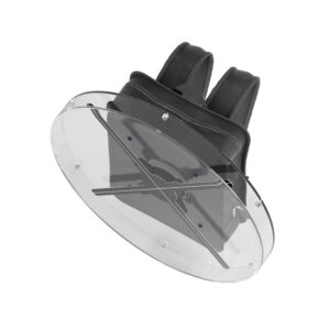 Ventilateur protégé par une structure robuste et un écran en plexiglas, pour une utilisation sûre en lieux publics.